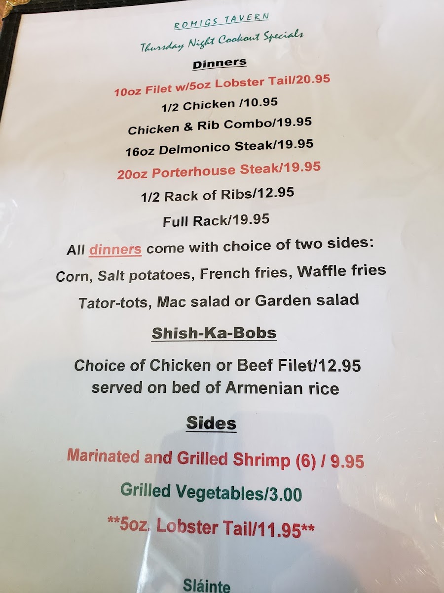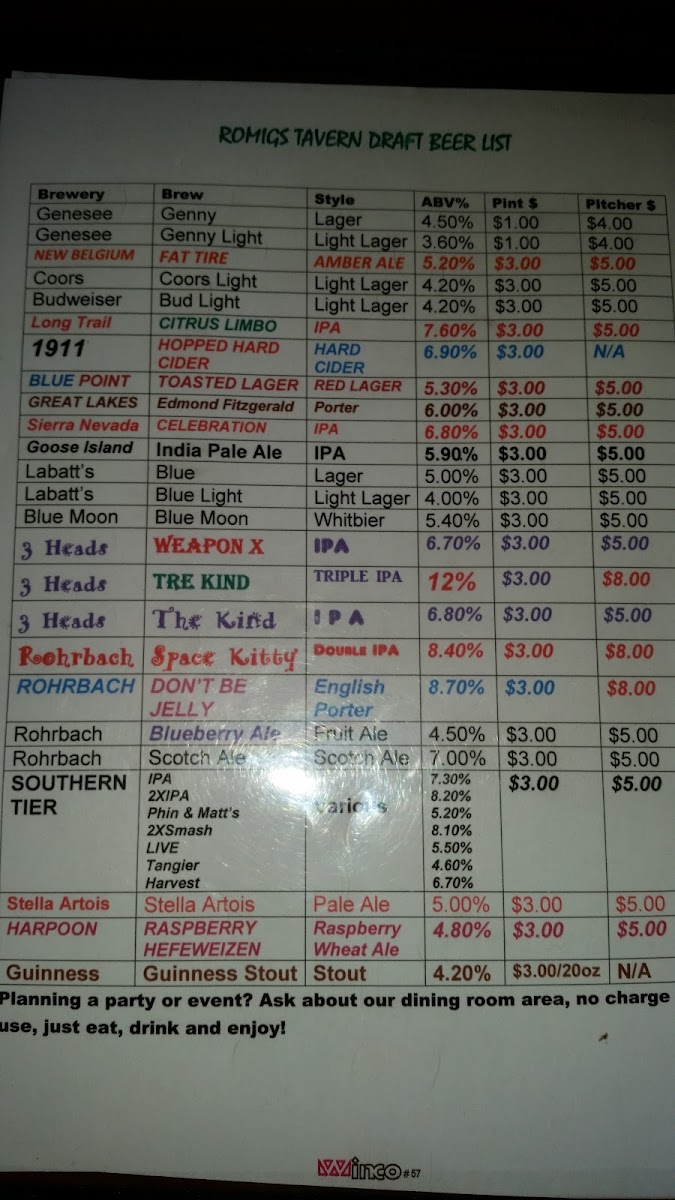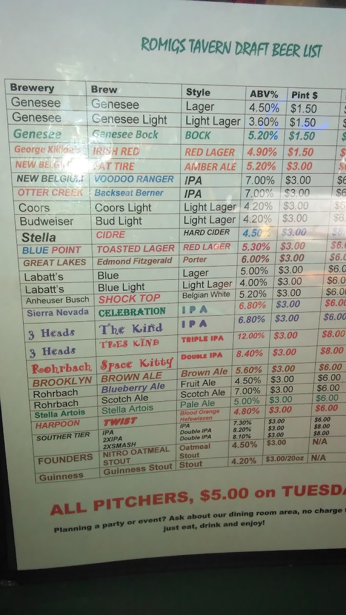 Welcome to Romig's Tavern, a hidden gem located at 18 Bennington Dr in Rochester, NY. This lively bar offers a heartwarming menu featuring both land and sea delights. Start your meal with their famous Broccoli French appetizer, or opt for the popular jerky boy wings on wing nights.